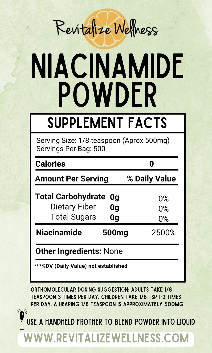 Our Niacinamide Powder is a no-flush form of Vitamin B3, designed to deliver the essential benefits of B3 without the flushing effect often associated with other forms of niacin. Niacinamide supports overall wellness by aiding in energy production, skin health, and cellular repair. This high-purity powder is free from common allergens and unnecessary additives, making it a clean, effective choice for your B3 supplementation needs.