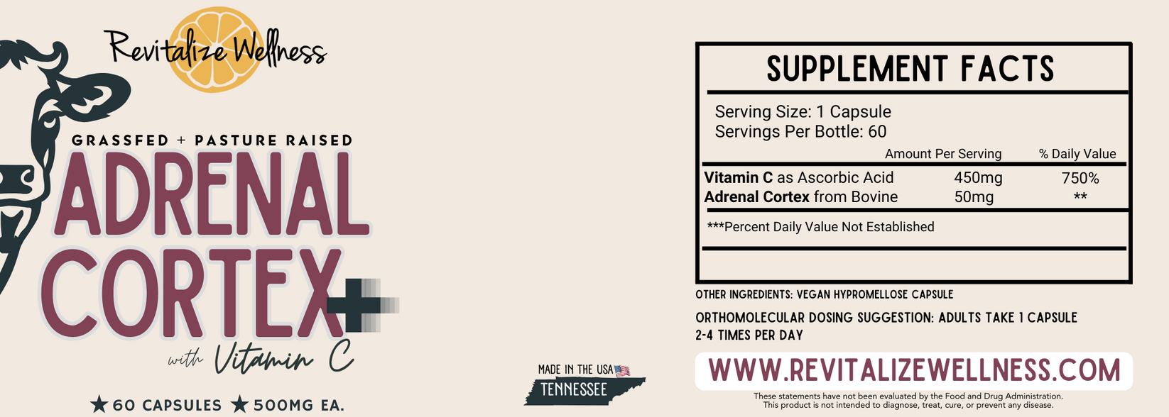 Adrenal Cortex + C offers robust support for your adrenal glands, helping to sustain balance and resilience, particularly in times of stress. This thoughtfully crafted blend unites the extensive benefits of Vitamin C with Adrenal Cortex extract to enhance adrenal function, aid in stress management, support glucose metabolism, and promote immune health. As key components of your body’s endocrine system, the adrenal glands produce essential hormones for overall wellness, from regulating metabolism to managing the body's stress response.