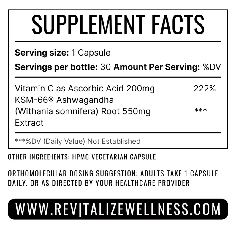 Combines organic ashwagandha and vitamin C to help calm the body, support hormones, and strengthen daily wellness.