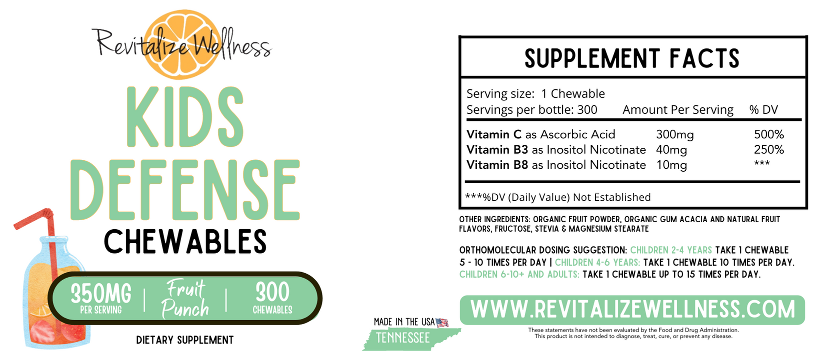 Enjoy our best-selling Kids Defense blend in a convenient on-the-go formula: Chewables! Toss them in your bag and take them on all your adventures for an orthomolecular dose of Vitamin C and B3 to strengthen your immune system, wherever you are.