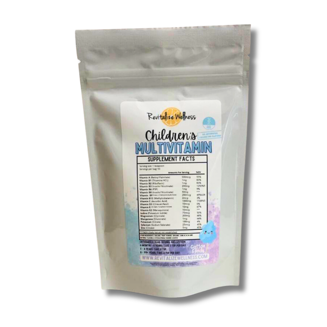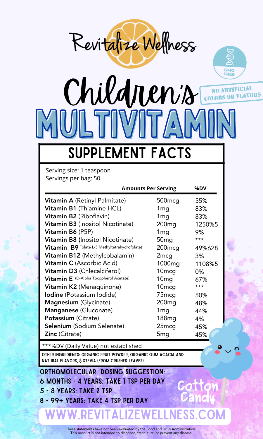 Revitalize Wellness brings you a mom-formulated multivitamin, thoughtfully designed for children (and adults!) to ensure they get the essential nutrients they need, especially for those with selective tastes. Offered in our popular cotton candy flavor, this multivitamin is perfect for daily support without any artificial flavors, synthetic dyes, gluten, or dairy.