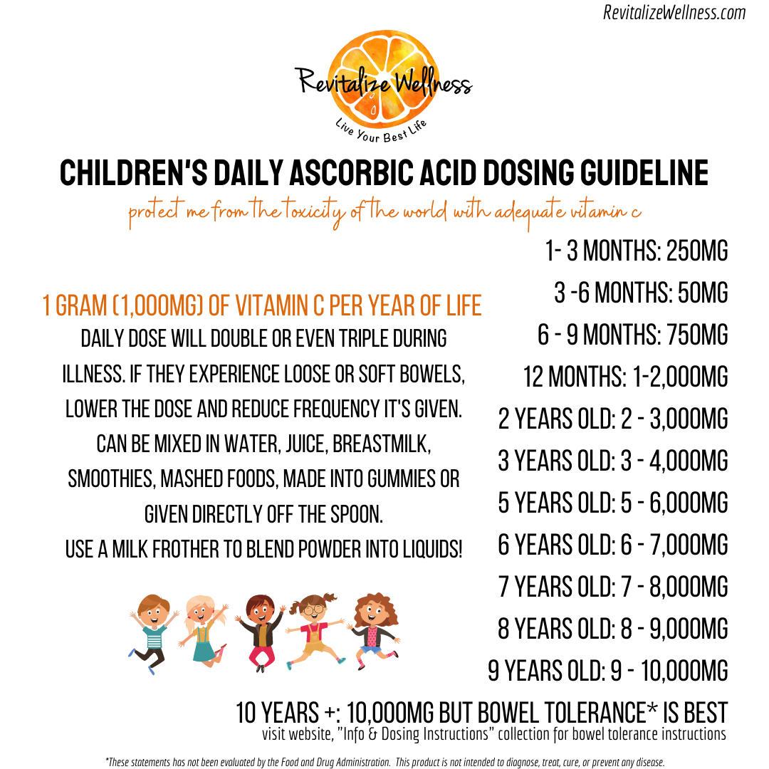 Dosage: 1/2 teaspoon equals 1 gram (1,000 mg) of Vitamin C.