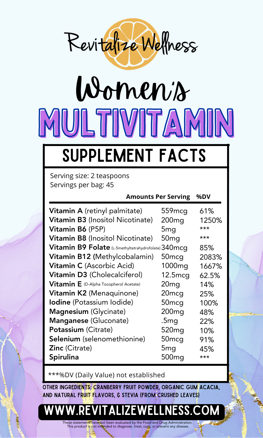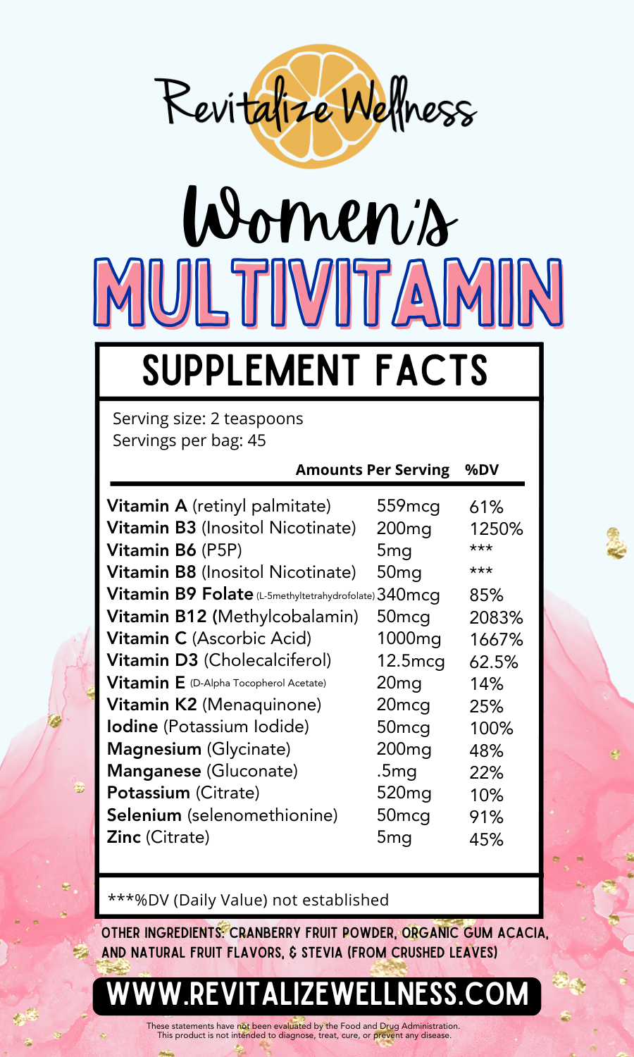 Nutritional Information: Each serving (2 teaspoons) provides an essential blend of vitamins, minerals, and natural ingredients designed to support a woman's body through all stages. Exact nutritional values per serving are available on the product label.